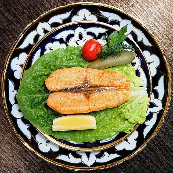 Шашлык из лосося жареный на мангале 120/82/30/3г