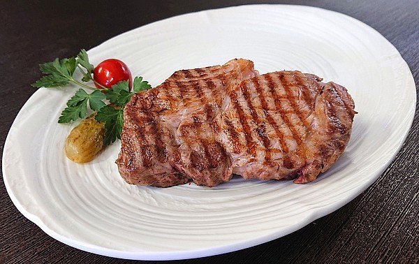 Стейк из свиной шеи с черри и огурчиками 150/30/5г